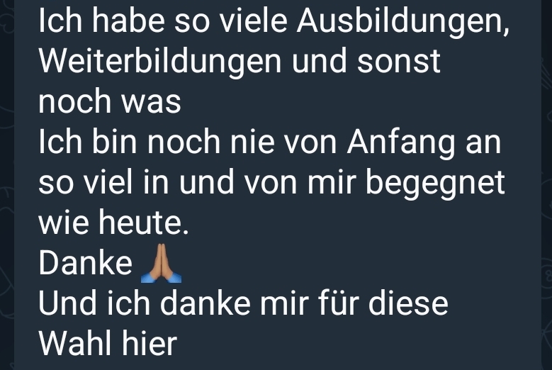 "Liebe Rosa! Bitte werde niemals müde, deine Wahrheit immer und immer wieder auf Instagram zu teilen. Habe viel Zeit mit Theta Healing Sitzungen verbracht, Ausbildungen dazu, Emotions-Code und Ausbildung dazu, EFT und Ausbildung dazu und anderes in der Richtung. Und nichts hat wirklich Veränderung gebracht, im Gegenteil, ich dachte, ich mache was falsch. Bei den anderen schien es ja zu wirken. Und dann kommst du mit Quantenphysik und Non-Dualität und ich sehe endlich Sinn. Mach bitte weiter, jedes Mal geht es tiefer und tiefer ins System. Die Welt braucht das!"