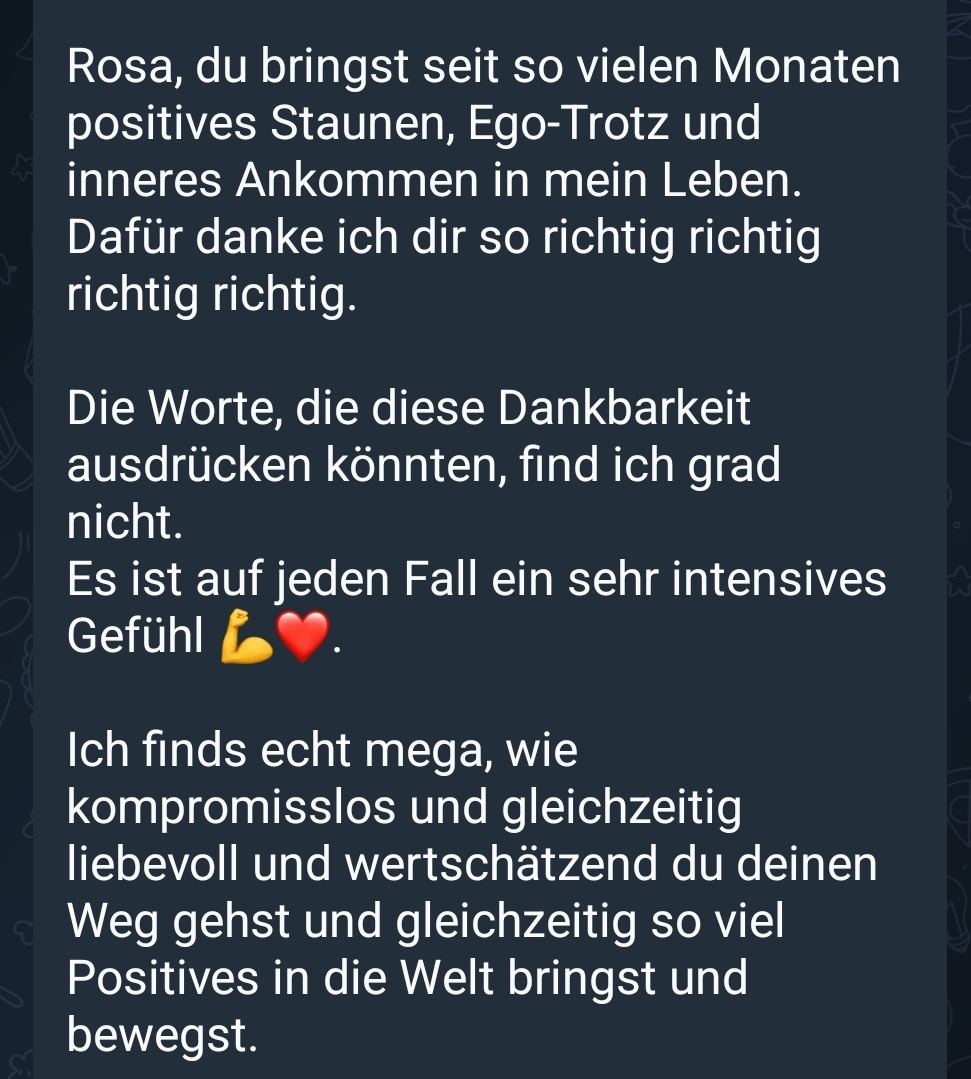 "Das schätze ich so an Rosa: Sie verstellt sich nicht, sie ist einfach ehrlich. Sie sagt auch ehrlicherweise, ihre Räume sind nicht für jeden was. Und das macht sie so authentisch. Es gibt eben auch viele Menschen, die in ihrer Opferrolle bleiben wollen. Die wollen in ihrem Drama bleiben und meckern, wie schlimm doch das Leben ist. Ich wollte dieses Opfer nicht mehr bleiben. Ich bin so unendlich dankbar dafür und freue mich auf meinen weiteren Weg. Damals undenkbar und heute so selbstverständlich.